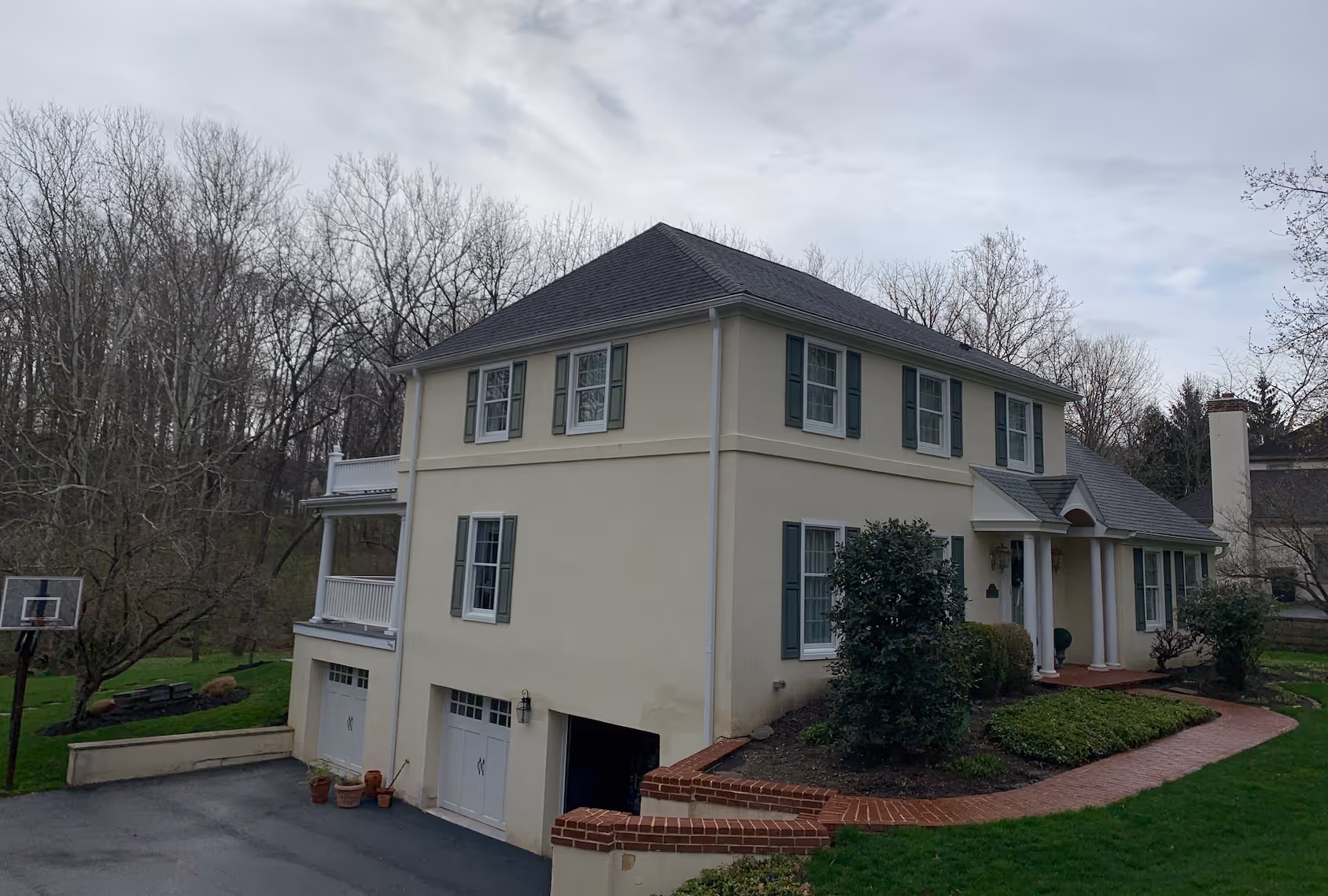The result is a modern, low‑maintenance exterior with timeless curb appeal, stronger weather protection, and custom touches like the metal garage roof and crisp trim details.